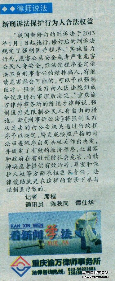 精神病患者水井投毒 法院判决其强制医疗一精神病患者在发病后,向村中居民的饮用水井中投放有毒农药,面临诉讼。万州区人民法院受理强制医疗的申请后,通知万州法律援助中心提供法律援助。近日,援助律师全程参与了这起案件的审理。 村里水井被人投毒 2013年4月26日,万州市民谭先生忽然接到自己母亲的电话。母亲告诉他,家里吃的水放出来有一层油泡子,并且有点偏绿。 谭先生立刻坐车赶到了母亲所在的万州某村,和村里的组长一起挨家挨户的查看。一番排查后,大家才发现,一些村民家中水缸里的水也是偏绿色,并且凑近一闻,还有一股农药的味道。接着,大伙又顺着水的来源查找,很快就发现,这些水都是从距离谭先生母亲家200多米远的一口井里打来的。 谭先生用矿泉水瓶装了两瓶有异味的水,来到公安部门报案。 警方立案后,一边将井水送去鉴定,一边入户进行了调查、走访。很快就得到了一条线索,村民谢某家中的农药百草枯不见了。而5月15日,警方的鉴定结果显示,井水中被人投放的物质,正是“百草枯”。据了解,事发时,谢某在砖厂上班,只有妻子高某在家。不过周围的居民都知道,高某患有精神疾病三、四年了。 精神病人投毒案被撤销 原来,案发前一天,高某因精神疾病发作,与谭先生的母亲吵了一架。得知妻子犯病,谢某赶紧从厂里回来向人家赔不是。可回到家里,谢某发现自己买的百草枯不见了。谢某问高某,高某就是不肯拿出来,想到妻子是病人谢某也没太强求。 可谢某没想到,第二天,高某的病更严重了,认为谭先生的母亲向自己家中投毒。于是高某就将家里存放的半瓶“百草枯”农药投放到了对方的水井中。 幸好村民们及时发现,才没有造成人员伤亡。 随后,重庆市精神卫生中心对高某进行精神病鉴定,鉴定其为精神分裂症,作案时无刑事责任能力。公安部门撤销这起投毒案。 法院判决强制医疗 不过,鉴定同时还指出,高某的危险行为风险因素评估等级为五级,具有社会危害的可能,建议加强监管治疗。于是,区人民检察院向法院递交了强制医疗申请书。 检察院认为,高某实施故意杀人行为,由于其意志以外的原因而未得逞,严重危害公民人身安全,要求对其强制医疗。法院审理查明后认为,高某投放毒害性物质,危害公共安全。虽然经法定程序鉴定为依法不负刑事责任的精神病人,但是其有继续危害社会的可能。日前,法院做出了对高某予以强制医疗的判决。 ◆◆律师说法 新刑诉法保护行为人合法权益 “我国新修订的刑诉法于2013年1月1日起施行,修订后的刑诉法规定了强制医疗程序。‘实施暴力行为,危害公共安全或者严重危害公民人身安全,经法定程序鉴定依法不负刑事责任的精神病人,有继续危害社会可能的,可以予以强制医疗。强制医疗由人民法院组成合议庭进行审理后决定。”重庆渝万律师事务所的陈继才律师说,强制医疗是限制公民人身自由的措施。新《刑事诉讼法》将强制医疗从过去的由公安机关通过行政程序予以决定,转变成按照严格的司法审查程序由司法机关作出决定,并规定了有效的救济程序,让国家和政府在有效预防社会危害、为精神病患者提供有效治疗、尊重和保护人权等方面承担更多责任。法律援助就是在这样的背景下参与强制医疗案的。 记者 席程 通讯员 陈秋同 谭仕华 |