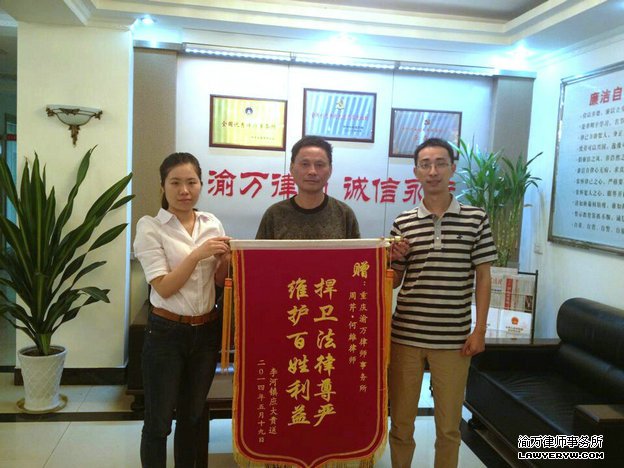日前,工伤职工应某送来锦旗,对渝万所周芹、何雄律师表示感谢。应某系某单位特招残疾员工,2012在上班期间被电锯割断手指,当年被劳动能力鉴定部门认定为工伤。2014年此单位以变卖给其他单位为由口头辞退了应某,随后应某及其家属多次找到单位领导解决工伤保险待遇,但单位均未给予其正面回应。在多次解决无门的情况下,应某及其家属找到重庆渝万律师事务所周芹、何雄律师。两名律师在了解了应大贵的情况之后,对应大贵进行了法律援助,并对案情进行了深入调查了解,通过对应某所在单位现处的具体情况进行查询,了解到此单位并未变更主体而是进行了变更注册资本登记,后对此单位进行了劳动仲裁诉讼。2014年5月15日劳动仲裁部门如期开庭审理此案,用人单位在仲裁员的主持调解下,申请人应某申请的赔偿项目全部给予赔偿并当庭支付。5月19日,应某为感谢两名律师为其维权,送上锦旗以表谢意。