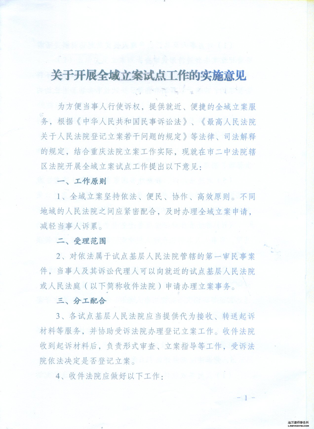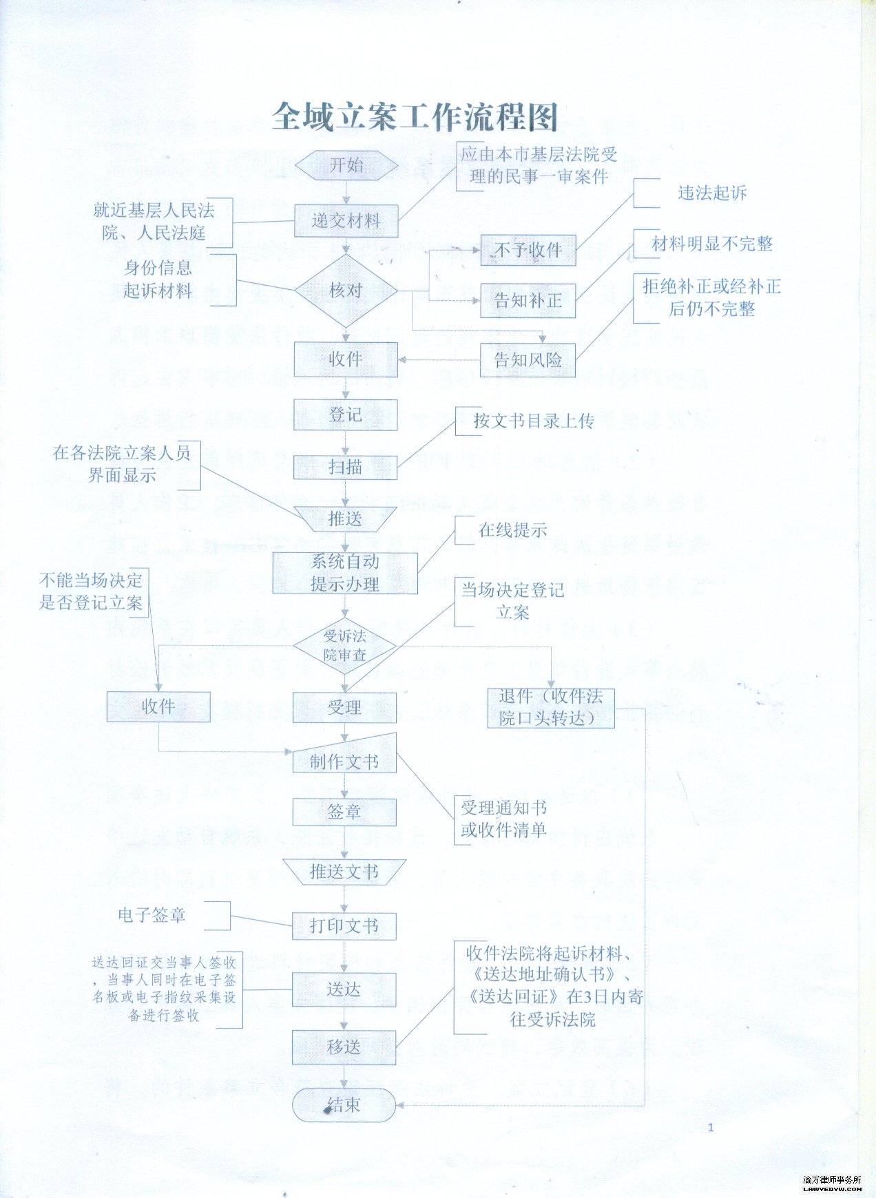 为方便当事人行使诉权,提供就近、便捷的立案服务,重庆二中院辖区已开展全域立案试点。就是说凡属于基层法院管辖的一审民事案,当事人及代理人可在二中院辖区的任何一个基层法院的立案庭或者派出庭立案。各试点基层法院应当提供代为接收、转送起诉材料等服务,并协助受诉法院办理登记立案工作。 全域立案工作流程: ![]() |