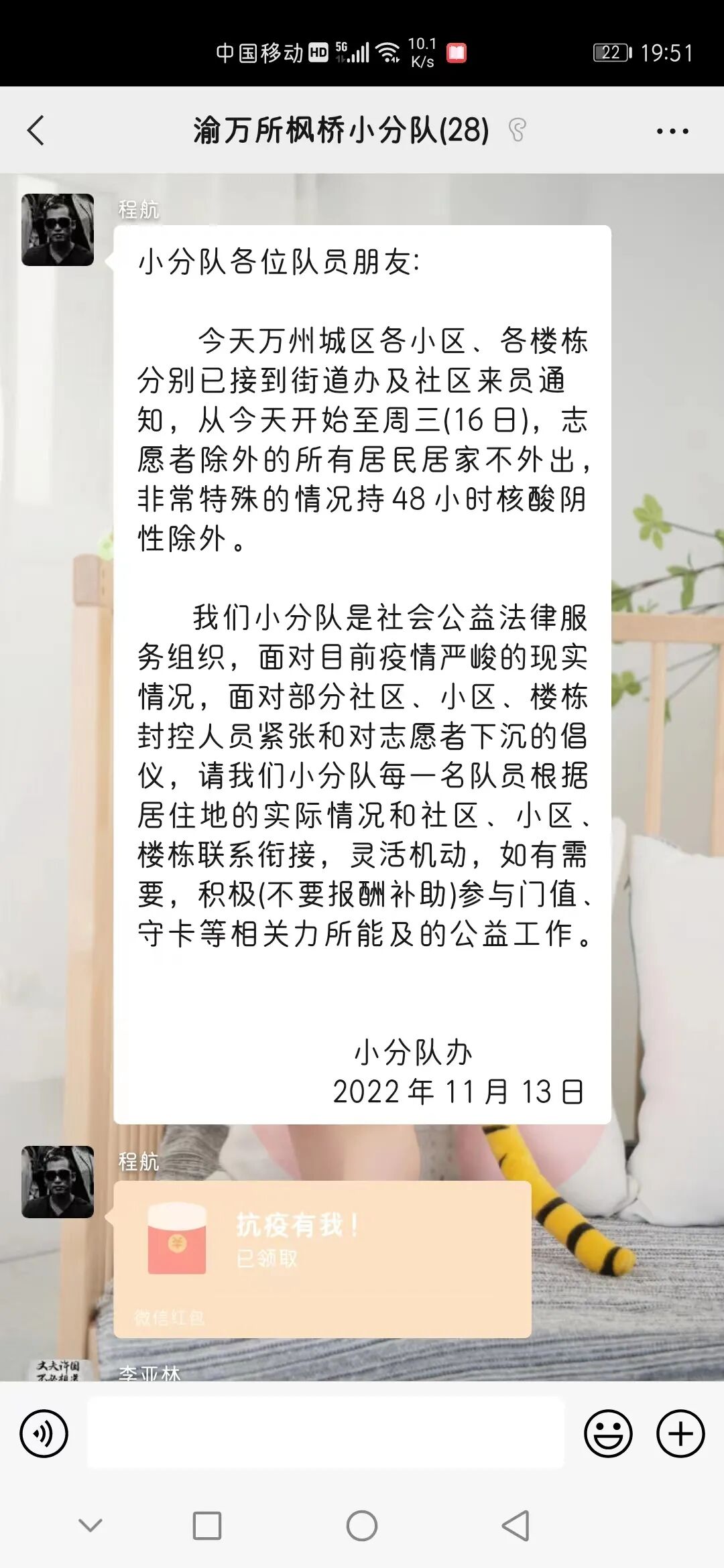 渝万所枫桥小分队号召全体队员:面对目前疫情严峻的现实情况,面对部分社区、小区、楼栋封控人员紧张和对志愿者下沉的倡仪,小分队每一名队员根据居住地的实际情况和社区、小区、楼栋联系衔接,灵活机动,不要报酬补助,积极参与门值、守卡、维护、劝导、法宣等防疫抗疫工作中。