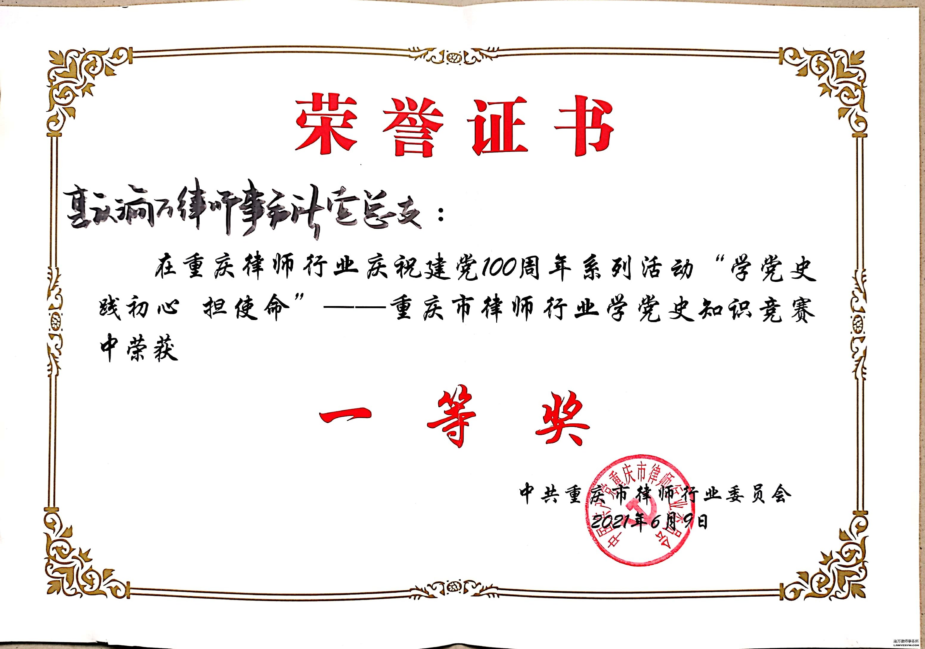 2021年6月,渝万所党总支在重庆律师行业学党史知识竞赛中荣获一