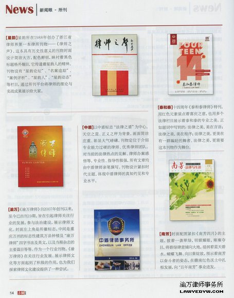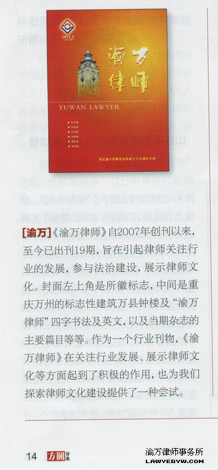 最高检主管、检察日报社主办的《方圆律政》杂志报道渝万律师事务所所刊:《渝万律师》自2007年创刊以来,至今已出刊19期,旨在引起律师关注行业的发展,参与法治建设,展示律师文化。封面左上角是所徽标志,中间是重庆万州的标志性建筑万县钟楼及渝万律师四